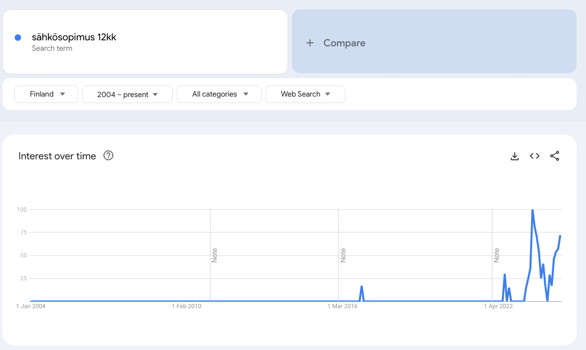 Myös Google Trends -raportin mukaan 12kk:n sähköt ovat olleet melko haettu termi viimeiset pari vuotta (2022 asti mitattuna):