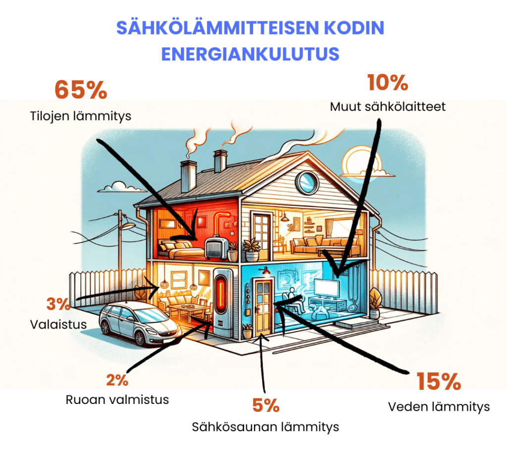 Säjkölämmitteisen omakotitalon sähkönkulutuksen osatekijät ja niiden osuudet kokonaiskulutuksesta suurin piirtein. Tilojen lämmitykseen kuluu noin 65% kokonaiskulutuksesta, veden lämmitykseen 15%, muihin sähkölaitteisiin noin 10%, sähkösaunan lämmitykseen 5%, valaistukseen 3% ja ruoan valmistukseen noin 2%.